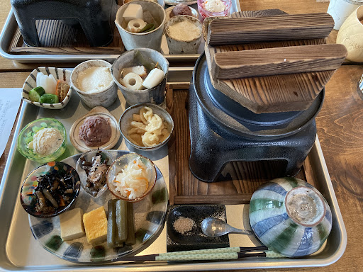 Read more友人の紹介で以前から気になっており、当日9時予約の電話をいれて11時半訪問。 店内は木造、一部天井が吹き抜け?みたいに高く古民家というかんじ。手作りの家具やインテリア、食器(陶器や木製)がかわいい。余談だけど、トイレのひよこの置物はご夫婦を思わせるかわいさ。あと、木の香り?がするような自然派消臭スプレーいいですね!笑 お客さんは他に3組程度。ランチはすごく悩んで生タコの釜飯と、とりそぼろ(味噌味)に。ドリンクは宇治抹茶だっけ?のほうじ茶と珈琲(5%しか流通しないらしいこだわりの品)がセルフ。香りよくおいしい。ご飯が炊けるまでおばんざい。一品ずつが丁寧に作られてるのがわかる。出汁がきいてて素材の味を引き出してて美味しい、体が喜ぶ!(^○^) おからとかフキとか苦手な時もあるけど、ここのは美味しいー!塩味旨み甘味、バランスよく楽しめる。 推しは、わらびのお浸しとおでん。 炊かれてる時のご飯の香りもいい匂い。タコ飯は生姜がきいててサッパリ、タコの風味やおこげのおいしさもよく感じられるo(^▽^)o最高です! そぼろは味噌の分甘いお味。美味しいけどタコの方が好み! 最後はミニ甘味、今日はバニラアイス黒蜜がけだけでなく、奥様がお庭で育てているというブラックベリーのジャムがけも選択肢にあると。お腹いっぱいでぼーっとしてきてたところに、がつんと果肉の酸っぱさが入ることで目が覚めます。勿論甘味とかもあり味も濃い!砂糖はあまり使用せず寒天などでトロミをつけるそう。これほんと美味しいー! 最初から最後まで最高に幸せなひと時を過ごせました♪ 子連れで来れないからタイミング選ばないといけないのだけションボリ。笑 両親つ...