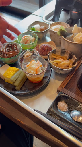 5分ほどで提供。 ご飯が炊くまで17−8分くらい、火が消えてから2−3分でOKとのことでその間おばんざいを食べならら待ちます。 おばんざいは10種類くらいあるんだけど、どれも秀逸。 特におでん。 その辺のおでん専門店に負けない素材と出汁。 おでんは小さな器だけどダイコン、コンニャク、さつま揚げ、はんぺん、ちくわ、こんぶなどがゴロゴロ入っててほどよい煮加減、汁までのみほせるほどうまい。