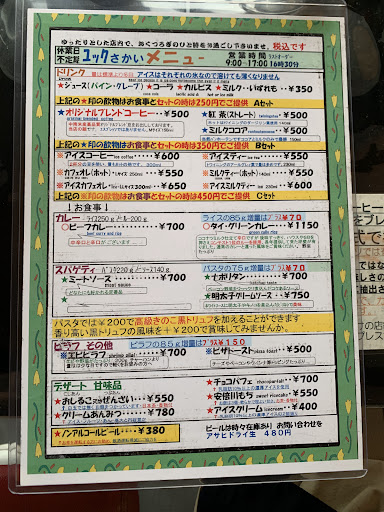 Read more〝喫茶〟ユックさかいです。 食事の種類が意外と言っては失礼ですがしっかりしてます。 グリーンカレーは具だくさんで、フクロタケも使っていて美味しいですよ。 眺めの良い席もあります。 以前はおもちゃ屋さんでしたが、廃業して店舗奥で喫茶店を営んでおられます。 温厚な店主から聞く昔の周辺の賑わっていたお話しなど、夕張のお話を伺うことが出来ます。 細かいご感想をイチイチ書き連ねる様なレビュアー気取りの連中には一切来て欲しくないお店です。他所へ行け。 出来るだけ無理せず...