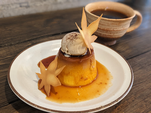 この日は気なってたかぼちゃのプリンを! とても映えるプリン🍮 かぼちゃとさつまいもの濃厚もっちりプリンで紅葉がチュイールで作られてるんですよ! 本物の紅葉の葉を使った演出はたまに見かけるけど、チュイールで紅葉を表現するとは! そしてプリンの上にはほうじ茶アイスがON♫ このスタイル大好き٩(♡ε♡...