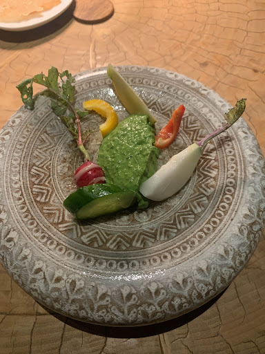 For me (perhaps those in my group will have differing opinions) this was most emblematically symbolized by the Bouquet dish. Meant to resemble a verdant garden, the flavors of lush and as fragrant as any floral arrangement. This, without being crass or too extroverted. The starting assemblage of vegetables with a dipping sauce was similarly stripped down and absolutely delectable.