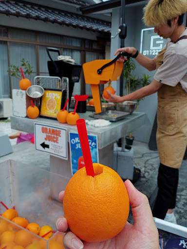More people are drinking the orange but their beers and toriten (chicken tempura). Toriten is a 名物 in Yufuin, and you can try it at this store. However, the way I see it, they are making more with their oranges (¥500) instead.