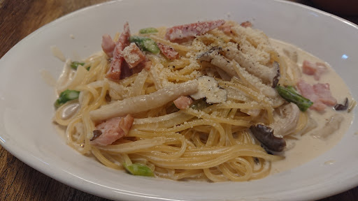 Read more国道沿いにある隠れ家的じゃない新しめの目立つ建物 同敷地内にある隣店のイメージに引っ張られるけど (つむぎセンター息子さんの経営?) こちらのお店は若い店員さん(接客超丁寧)ばかりで 客も若いカップルとか女子会マダムとかで別物ですね 蔵パスタ~白~¥1300を注文 きのことベーコンのカルボナーラです 程よい味のソースと食べやすいスパ 見た目より量があるので味変用アイテムが欲しいかな 黒胡椒でも良し このお店オリジナルなら尚良しです まだまだ伸びしろありそうなので いつかまた...