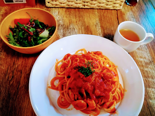 50号線沿いを走っていて、 何となく気になっていた蔵カフェ。 ついに入ってみました。 ランチに白いパスタと赤いパスタがあったので赤いパスタの方を注文。 あと、つむぎブレンド。 ランチはスープとサラダ付き。 スープはやさしいお味で美味しい。 サラダはドレッシングあっさり系。これも好き♪ パスタは魚介類が入ったトマトソースベース。比較的あっさりしていてトマトの甘みがいかされていて麺の固さもちょうどよい感じでとても美味しかったです♪つむぎブレンドはとても香りが良いです。苦くはなく、どちらかというとマイルドな感じですかね。 建物は古民家風で静かに音楽が流れゆったりと至福の時を過ごさせてくれました。 次回はスイーツ盛り合わせも食べたいです。