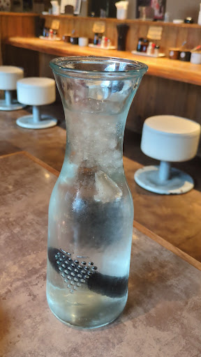 お冷はピッチャーで提供されすが、中に炭が沈められていて洒落乙です。