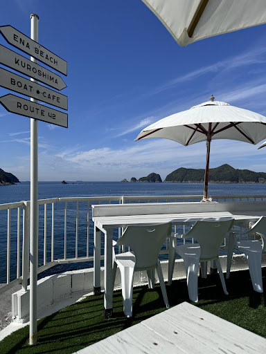 Fun cafe at the end of the road. Grest lunch menu and snacks. Coffee choices tempting and desserts. Super views of the sea. Seating inside or out. Everything freshly prepared and delicious. Seating outside on the porch or cozy tables inside. Parking next to the cafe but the access road is very narrow and not something I'd negotiate on a busy weekend. Huge parking area on the right with a giant sign and a 300 meter walk we enjoyed instead. Getting off the expressway Google routed us over some very narrow blind single car mountain roads into Ena Marina. Much better to head to Shrasaki Park first the use 24 going north to easily roll into the Cafe. A hidden gem that will reward you with stunning views, relaxing atmosphere, and yummy food and drinks....