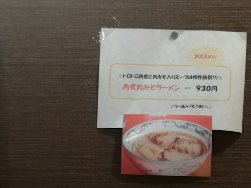Read more9月一回目の三連休初日に伺いました。 1時丁度くらいに入店したのですが、ひっきりなしにお客さんが入ってきて人気の高さを感じます。しかもさすが角煮ラーメンを売りにしているだけのことはあって、入ってくるお客さんのほとんどがオーダーしていました。 一緒に入った家族は三色味比べ定食をオーダーしていたのですが、そこから少し分けてもらった酢豚もこれまた絶品で、とにかくどのメニューも材料というか、メイン材料(今回なら豚)をケチっていないガッツリな一品ばかりで嬉しいお店です。 多少店舗の外観イがロモノ系のお店かと思わせる雰囲気はありますが、中に入ればちゃんとした中華レストラン。おみくじ箸袋が至る所に結び付けられているのはご愛嬌ですが、店員さんも非常に愛想の良い方で、味とボリューム、そして価格設定と、どれをとっても満足行くお店でした。 行くぞ行くぞと息巻いてやっと来られたこの期待を裏切ら...