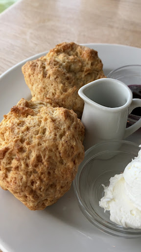後日、スコーンセット1,300円(アップルカモミールティー)を注文。カウンター向かいの個包装されたテイクアウト用スコーンを破って温めていて、少し驚きました。 スコーンは上下に割れる通常タイプではなくゴロっとした塊でしたが、食感は普通にスコーンでした。そして甘過ぎず楽しめました。ケーキよりオススメかな。ハーブティーもティーバックっぽいけど普通に美味しく頂きました。