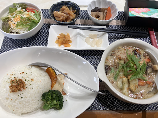 小鉢2、サラダ、ラッキョウと福神漬け、ご飯には温野菜、そしてグリーンカレーは盛り盛り具沢山。グリーンカレーが熱々な出来立てでしたので、サラダや小鉢から食べます。 サラダはドレッシングが少なくて足りませんが、素材を楽しみます。小鉢は煮物ときんぴらで手作りながらも充分な量です。ご飯の皿にはグリルされたカボチャ、エリンギ、ブロッコリー。少し冷えてきたグリーンカレーはイカ、エビに茄子、人参、椎茸がこれでもかと入って上から水菜が掛かっています。 グリーンカレーはそれ程辛くはないですが、具沢山なあまり複雑な味になっていてグリーンカレー擬きになってしまった感。不味くはないですが、モッタリしています。 全体的には美味しいものの、肝心のカレーがカレーとしては残念な味で盛り下げます。多分、具を入れ過ぎてるだけなので直ぐ改善出来るはず。