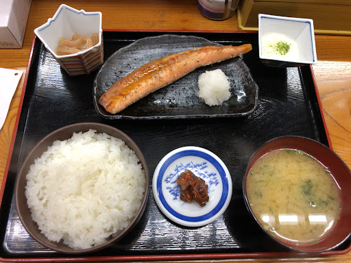 他媒体で見つけ、美味しそうだったのでお邪魔。 鮭ハラス焼定食注文。 暫く待っていると皿からはみ出そうなハラス焼きが! 香りがよく、かつ焼き加減も丁度良く期待が持てます。 が、食べてみると、かなり塩辛い! ご飯普通盛りでは足りないですね。 塩抜きしたら良いだろうに、地域がらなのかな? 周りみてると、鳥から定食がよく出ていたので、今度はそっちを頼んでみよう。
