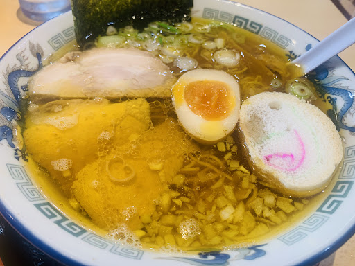 スッキリした色合いのスープに、大き目のチャーシューが3枚、みじん切りのタマネギ、そして秋田県南ではお馴染みのトッピングのお麩。