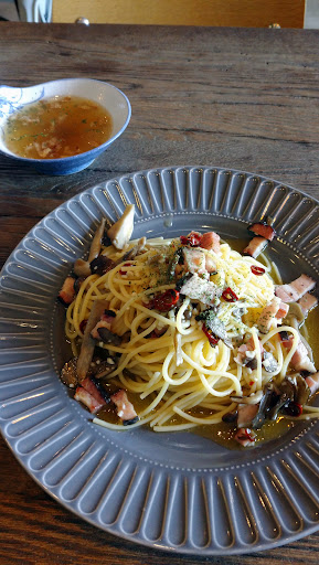 ペペロンって油多くて乾いてるイメージだったけど、こちらのはほんの少しスープ?が入ってて、具材のキノコとかベーコン(調理段階で表面だったと思われる部分が黒い…焙り?旨っ😋)とかにこのスープが絡んでとても美味しかった。 パスタの量も、女性なら結構満足できると思う。 (パスタ好きさんなら判ると思うのですが、最初にお皿のパスタの山を崩した時に、あ、結構入ってる💕とテンション上がった) あとは、完全に個人の好みの話で、もう少しパスタが温かいと星5だったかな。 でも、温度はあえてなのかも?