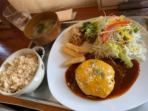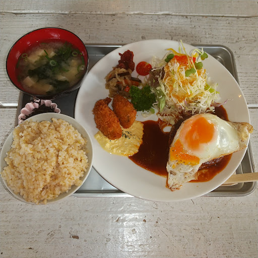 Read moreお昼は❗️善通寺市与北町字新開のカフェ食堂「ランプ山地ファーム」で「目玉焼きハンバーグ&カキフライ」にアイスコーヒー🍴 此方は❗️ちょっと隠れ家的なお店で、カウンター席、テーブル席、小上がり席がある店内が落ち着いた雰囲気で良いやねぇ~😊 結構人気なお店らしく、開店直後にア~😲 箸でサクっと切れちゃう、ふっくらとしたハンバーグに半熟の目玉焼きがのったビジュアルが素敵だやねぇ~😆 揚げたて熱々のカキフライもイケてるしぃ~😋 ご飯が玄米ってのが、健康的で良いよねぇ~😃 豆腐とワカメの味噌汁も良い感じぃ~😉 だけど💦サラダはもぅちょっと盛りを良くして欲しかったやねぇ~😳 ボリューム的にもしっかりとしているンで、満腹の満足ぅ~😁 けど💧お客はアベックが1組居た以外は女子ばっかだったンで、ムっさいオっさんの行くお店...