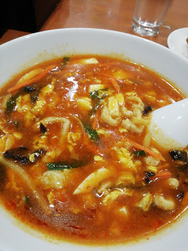 『酢辣湯麺』 極細ちぢれ麺が食べやすかったです。 濃厚なスープに細切りの豚肉。赤身でたべごたえあり! 辛さと酢のさわやかスープが美味しすぎました。