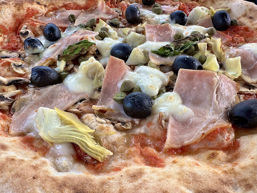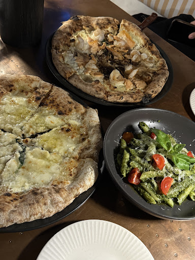 We ordered garlic bread and olives to share, which arrived in good time. Our plates were cleared and we then waited a considerable amount of time approx. 20-30 mins for 2 of the pizzas to arrive. We started sharing these as it was taking sometime for the last meal, Aubergine Parmigiana, to be served. We were half way through the Pizzas and then got up to remind them that we were still waiting for the last meal. They pointed to the oven and advised this was being cooked freshly. At no prior point was this mentioned e.g. on the menu or by the waitress. It did appear that this had not been prioritised in the preparation and delivery. In addition to this, it did appear that take-aways pizzas approx. 5 or 6, were given priority which further delayed the delivery of our food.