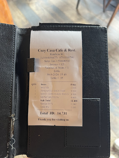 Be aware of 26% charge added to EVERY item on menu (back page of menu 10% sales tax PLUS 16% service charge) Asked x3 times for the price of the “local dish” the waiter recommended & eventually told 55JD!! (Nothing on the menu comes close to this price). Paid for the drinks we had (3JD each for two lemon & mint; Manager tried to charge us for lemonade 3.5JD each - when we showed menu & drink consumed, told these prices were ‘out of date’.) I cannot give star rating for food as we didn’t stay to eat. Atmosphere & decor is colourful & warm. Service was defensive & hostile once we realised overpriced recommended meal, the 26% gouge &...