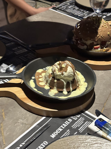 But let’s talk food. Fuma doesn’t just win with atmosphere—the food is unreal. Their burgers are massive and juicy—one could easily feed three people (though you might not want to share). The honey mustard chicken wings were so tender they melted in my mouth, and I still can’t get over the dessert: a Dubai chocolate brownie served warm with creamy vanilla ice cream. When the chef personally came out to pour hot chocolate sauce over it? Pure drama, pure joy.