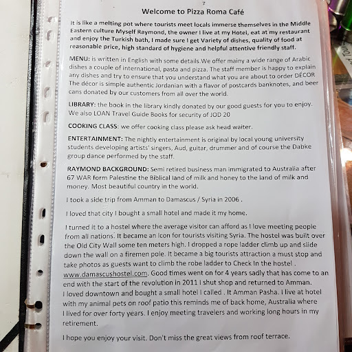 After visiting everything we planned in Jordan, we returned here on our last day in the evening (which was much busier than our previous mid-morning visit). There were more people sitting down, and more working staff people). We ordered maqluba, mansaf, kufta meat pattie with tahini sauce, and of course tea. While waiting, a guest and his girl friend came in to hangout and wait for someone... they heard us speak English and we engaged in conversation. Next thing you know he was sharing his falafel with us and we were exchanging contact information. Pretty cool. When he left, our food arrived... it was great value (quality and quantity) for the price. We licked our plates and wished we could've dined here more :D we engaged in conversation with one of our servers (Zack from Cleveland?), and it was very interesting hearing his background. There is a lot of love and kindness in Pizza Roma Cafe, and the value for the variety quality and quantity of food is very good. Recommend for lunch or dinner if you're...