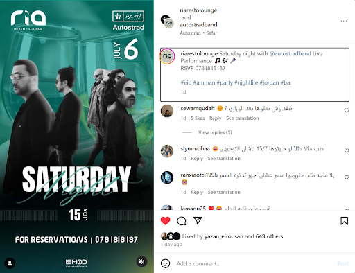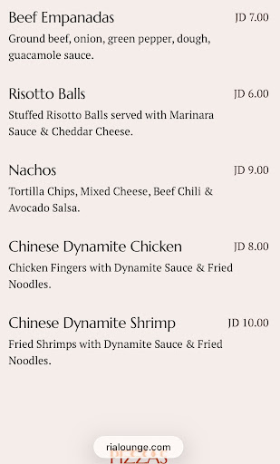 Read moreI was looking forward to a night out with my mom who just came back from a long trip, but Ria Lounge ruined it. They advertised 15 JDs for a concert, but added a hidden 20 JD charge when we tried to book. the manager was dismissive and hung up on us. False advertising and poor customer service. I’ll never come back to this place again