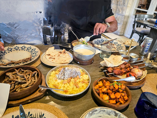 We had the pleasure of visiting this Jordanian restaurant twice last week. Elegant, leafy courtyard on the outside, beautifully decorated space on the inside. The first night was a Saturday, and there was a lively crowd. The first waiter found us a seat in the courtyard, and then a second waiter saw us and told us we needed to limit our stay to an hour because they were busy.