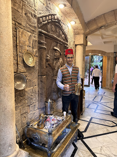 Read moreLovely restaurant in Amman! We had the opportunity to visit it thanks to our guide Ziad. We were greeted with strong tea by a traditionally dressed waiter who was happy to pose for a photo. You can also see in person how the typical Arabic fine crusts are prepared by hand . The interior transports you to the beautiful Arabian world. Large comfortable tables and chairs, full size camels in silver. Very beautiful garden. The service is more than great! At the end of our lunch we were served fruit as a compliment and our waiter made us lovely flowers from them. The food was very tasty definitely try the shrimp soup, the appetizers served with fresh baked bread and the meat cooked on the BBQ. Don't miss their dolma - it was incredibly tasty! We were very pleased and charmed by the hospitality of this restaurant and highly...