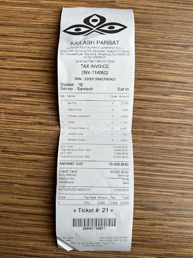 Read moreIt’s my second time visiting Kailash Parbat restaurant. Great spot to enjoy a delicious meal with a spectacular view of Khalifa bin Salman Avenue. I rated only one star for the service as while we were giving our order or enquiring about anything at their desk, the person taking our orders was on call and for sure he wasn’t speaking with the company but it sounded like a personal call. Also he was taking gaps in replying to us. His phone was on his ears all the time. I am posting the bill so the management knows the date and time, and view their cctv cameras to improve their quality of service. Apart from this, I asked for a little extra ghee and he was very helpful to offer us. We ordered Dal fry with Jeera rice, Paneer Lawabdar with naan, masala Chaas, salted lassi and water. The salted lassi was extremely thick. We added water and made it smooth to drink. The rice is usually soft but this time it was dry and a bit undercooked. However, The food is super tasty with the right blend of masala. I totally recommend this restaurant. Definitely...