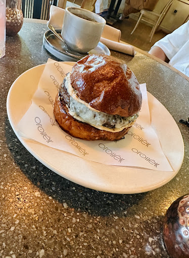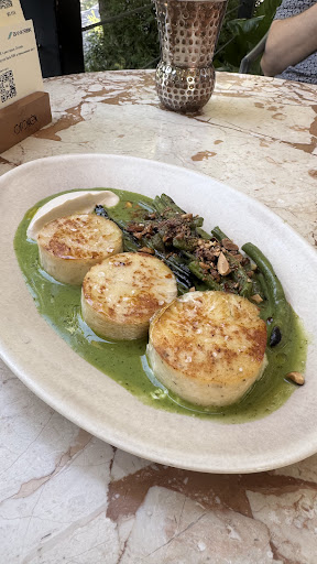Specializing in meat and grill, the restaurant also boasts an oven for baking fresh bread and flatbreads. Our first visit was marred by grill issues, so we returned for a second try and also stopped by for breakfast. The okroshka was a highlight—perfectly diced, crisp vegetables, well-cooked meat, and a thick, refreshing ayran base, delivering a vibrant, cooling flavor ideal for a hot day. The grilled seabass was expertly cooked, juicy and flavorful, though the sauce slightly overpowered the fish’s delicate taste. The pike perch cutlets stuffed with shrimp mousse were a bit dry, but the soufflé-like filling added a pleasant texture and saved the dish, resulting in a decent flavor profile. For breakfast, the brioche with eel and poached egg disappointed—only two thin slices of eel got lost in the egg and bread, not worth a reorder. However, the chicken and egg burger was a winner, with a soft brioche bun and juicy chicken patty, making for a hearty breakfast choice.