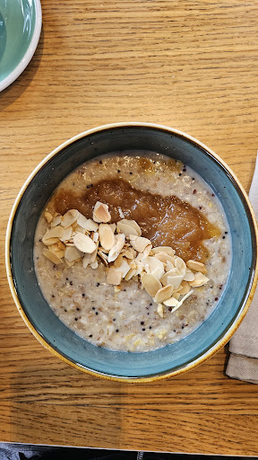 Mediocre at best, with a very good environment and staff; however, the tea was overly sweet and didn't have a strainer; therefore, all of the herbs and fruit pieces escaped into the tea. We also ordered the "Almaty Breakfast." I must say it's gorgeous looks-wise; however, the actual taste wasn't that special and didn't hit the spot. The toast was too dry and flavorless to be considered French toast but too fluffy and eggy to be considered plain toast. As for the caramel apple oatmeal, I was very glad they had other milk options—the appearance was great, taste-wise it was good, but I was just expecting the caramel to be a bit more noticeable as there was barely any flavor. Overall, the food isn't...