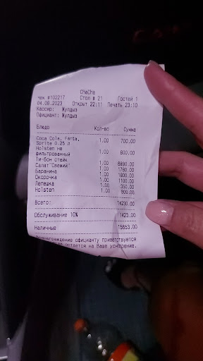 Заведение хорошее.. Но официантка Алиса непрядочная,аферисткой можно назвать((( Когда потребовали счёт ,сказала что закрытый счёт она уже нее может найти,как понять?? Приписывают лишние суммы,ползуясь доверчивостью посетителей.. Мы так и ушли не добившись чека ,расклада нашего заказа(( Даже администратор не помогла разобраться в этом вопросе... Это случилось сегодня ,т.е...