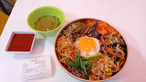 Были в обеденное время 8 марта. Народу было очень много, все столики внутри и снаружи были заняты. Контингент, как показалось, в основном молодые девченки- фанаты k-pop. Интерьер понравился. Светло, свежо. Заказали куриный рамён, токпокки (не острый, без сыра), кимпаб с лососем, янкоги кимчи поккым (баранина с кимчи, подается с рисом), пампушки, чай, корейский кофе 3 в 1. На кассе была очередь, пока ждали очередь, отслеживали тех, кто вот-вот должен встать, чтобы занять их столик. Надо отдать должное, блюда готовятся быстро, обслуживают тоже быстро и вежливо. Рамён не впечатлил. Обычная острая корейская лапша из супермаркета, которую надо варить, но с добавлением кусочков отварной курицы и лапшички из омлета. Токпокки пробывали впервые, сравнивать не с чем. Понравился кислосладкий соус в котором они были. Надо было брать острый, не хватило остроты. Кимпаб- порция добротная, вкусно. Подаются с соевым соусом. Янкоги кимчи поккым чем-то напомнил баранину на жаровне из китайской кухни, но в состав входит кимчи. Мясо мягкое, по вкусу- на любителя, кимчи перебивает вкус мяса. Я бы поставила 4 из 5. Крылышки в кляре подаются с розовым соусом (кетчунез) и кимчи. На один раз неплохо. В kfc вкуснее. Пампушки паровые. Обычные. Удивил корейский кофе 3 в 1. Взяли только потому что прозвучало "корейский, думали будет что-то отличающееся. На деле оказалось, обычный кофе 3 в 1. Так как людей было много, возле нас постоянно стояли люди, ожидавшие когда мы поедим и встанем. Из-за этого поневоле стараешься быстрее есть. По залу развешаны телевизоры, по которым крутят клипы корейских поп-групп. Для молодежи место прикольное. Нам как-то не очень зашло. Цены довольно демократичные. Для таких порций, можно сказать...