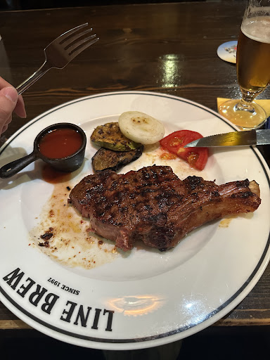 We were in Almaty for just a few days and on the first night were looking for somewhere easy and reliable and found Line Brew listed on several sites as a likely choice. We were not disappointed! My partner is Italian and has eaten horse since childhood and always likes to try it outside of Italy if possible. I must say the large, beautiful, and perfectly cooked (rare) fillet steak she was served was one of the best pieces of meat I have ever tasted. I had the "Devil Steak", which wasn't as distinguished a piece of meat, but was anyway quite delicious, and was served with a pleasantly piquant sauce the suited it perfectly without masking the flavour. The accompaniments were good, too, though perhaps not quite up to the steaks; we had a salad and some corn cobs, though there were other items to choose from. With a litre of beer between us our meal came to about USD60 which was certainly very good value. We were going to try the Line Brew in Astana but ended up opting for other choices. In any case I would be back here in a heartbeat when coming back to this...
