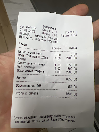 Not about money but 10000 just for the most simplest salat , most simplest plov and the most simplest green tea and the most overrated dessert is literally a robbery!