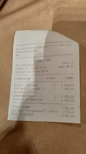 Общий счёт с учётом обслуживания составил 8085 тенге. Я передал официанту карту и тот шуткой сказал "таааак сколько у вас по чеку?.. 9085 тенге.угу." - и протягивает терминал для бесконтактной оплаты. Мы его поправили в сумме счета. Он согласился, увидев его, но даже после этого снова ввел 9085 тенге и быстро протянул нам к оплате терминал, наверное, в надежде, что мы не проверим снова. Увидев не то число, меня это возмутило. Скандалить я не стал, потому что был гостем города (возможно в Казахстане так принято).Это просто наглость и неуважение к гостям. Такое поведение персонала не достойно даже 10% чаевых, которые в заведении автоматов включают в счёт. Фу.