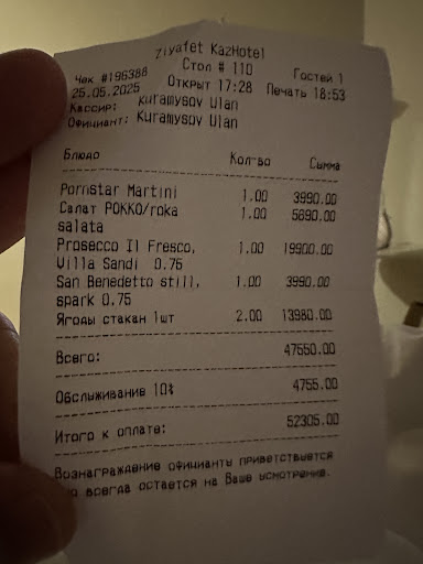 Ordered a bottle of Prosecco and my date some food and a cocktail. All find until the waiter pointed to my glass of Prosecco and asked if I would like some berries like strawberry or raspberry…..I said ok since any other time a waiter or bartender asked me this is was because they were putting a few berries in my Prosecco…..no he brought out two martini glasses with berries which contained about one small handful of berries each. When the bill came it was 13,980 tenge ( $27) which is absolutely absurd. Needless to say it was my first and last time going to this restaurant and will boycott their whole group of restaurants and stick to ABR group which has much better service and quality of restaurants. Hayat group is terrible in general for quality, atmosphere,...