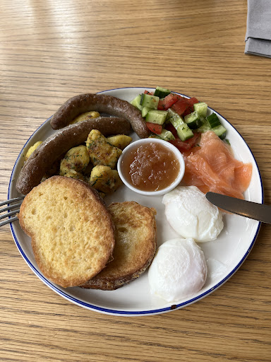 Almaty Breakfast which included: two poached eggs, horse sausage, salmon, potatoes, two french toast and a salad. It was very good. If you are looking to get a large breakfast before you walk around the city, this is it