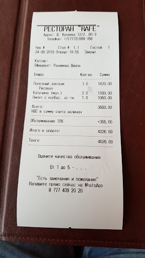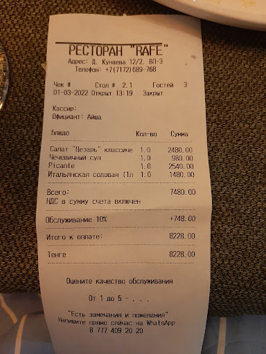 Read moreКак и во всей сети кафе Рафе, эта точка в Жилом комплексе Нурсая очень уютное и атмосферное место. Идеально подходит для семейных обедов и ужинов, для посиделок с друзьями. Очень радует тот факт, что не подают алкогольные напитки. Если вы пришли с детьми, то для них есть отдельный столик с раскрасками и всем необходимым для рисования. Из меню больше всего люблю крем-супы и пиццу. А десертное меню в Рафе - это отдельная тема. Каждый раз можно приходить и пробовать новое блюдо. Так же у них есть система накопительной скидки - для этого нужно открыть у них специальную карту и накопить ужинов-обедов на 150.000 тенге, что не так много. Раньше у них была скидка в 15% для студентов и преподавателей Университета Казгюу города Астана. Одно из любимых...