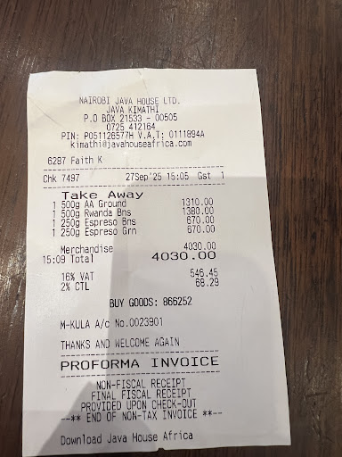 Β Β Β Read moreI stopped by Java House at the end of my trip to Kenya to purchase some coffee beans to take back home. Unfortunately, I was met with impolite behavior from a staff member named βF*th,β which was very unlike the service I normally receive at Java House.