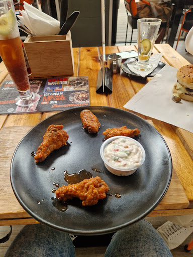 Read moreIt's a burger joint in the modern american style. They offer smash burgers, wings, ribs, etc. I opted for the wings with blue cheese sauce as a starter and a smash burger. The wings were very small, not at all what I expected, especially considering the price and the sauce had none of the flavour and the pungentness of blue cheese (which really disappointed me as I was looking forward to have that combo I've often loved in SA). Then came the smash burger, which again was underwhelming, as I was expecting much more flavour from the meat. My daughter had the ribs, and those, on the other hand, were very tasty and fell off the bone. I had a mocktail and a cocktail, and both were the highlight of my meals. All in all, it's an okay place to lunch while in Sarit, enjoying the outdoor ambience (the indoor is rather bleak unless you're watching one of the screens), which compensate for the food lacking that 'je ne sais quoi' the...