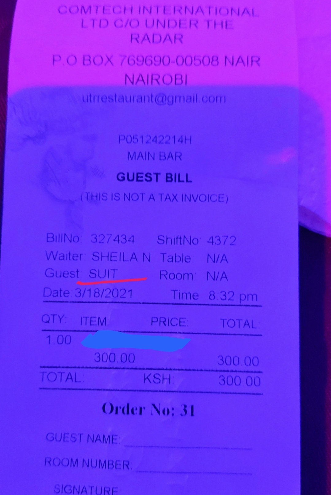 We decided to go support our friend despite having a long & tiring week. It was a good evening, the Karaoke was fun and the crowd was just awesome. When we asked for the bill we realised that the bills have descriptions of the guests, mostly based on the superficiale. It was cool to see that my pal had 'suit' as his description because hey, he was wearing a fine suit. My other pal had his description as 'specs' and we thought, cool. When I looked at my bill, it described me as 'mean'! The shock! I didn't even bother looking at the other bills. I was taken aback because when I talked to the waiter this is how the conversation went; "Hi Sheila, how are you today? Could I please have........." The next time we talked was when I requested her to bring our bill.