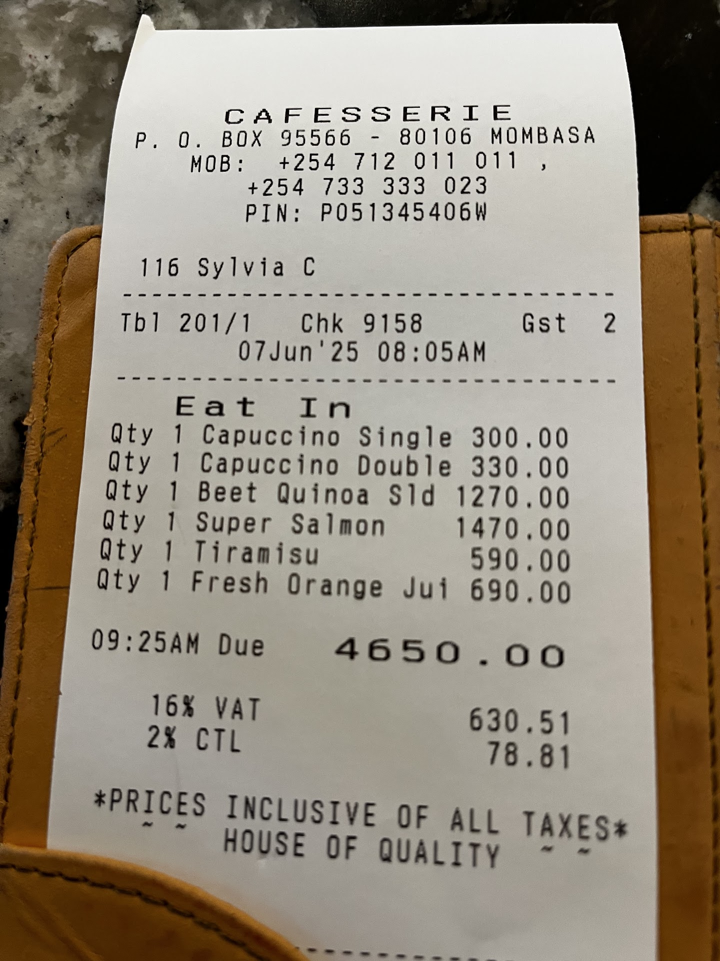 Read moreAs some who travels time to time ,Mombasa has always been in my bucket list of business trips.Its not my to go places but it comes in handy when business calls .Anyways am a lover of great lattes,pasta and a serene ambiance,vibrant atmosphere and just love to see people dining and enjoying themselves with great meals and drinks.This Restaurant is awesome,the food was amazing and the staff were very knowledgeable about the menu and they even gave me options that saved me lots of waiting time ,had a great experience and I highly recommend to anyone looking for a restaurant to just chills and enjoy a good meal and drink.This place is great.I loved my experience there however if only they can hire one super energetic supervisor to be walking around and checking in on guests feedback and suggestions.Particularly the seats just felt off, the table is taller than the seat ,felt like I was eating from the hanging gardens ,pliiiiz somebody change the damn seats.Otherwise the...