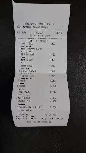 One thing that bothered me was the expensive prices in comparison to other Lebanese restaurants. For instance, a can of Pepsi cost KD1.15/-. Additionally, parking was available, but it was difficult to find a spot nearby.