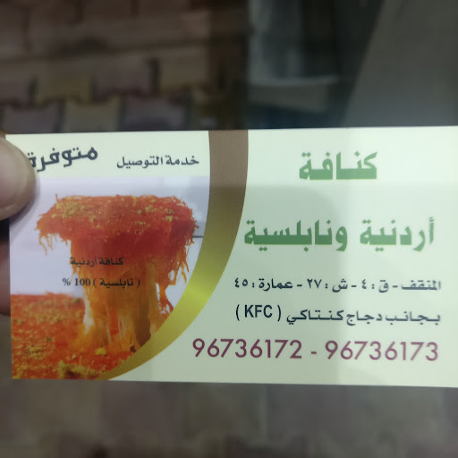 الكنافة الشقراء متوسطه المستوي ....ليست علي المستوي المطلوب ولا انصح بتجربتها تشعر و كانك تاكل حبنة بالطحين .....بها عيب و حينما اخبرتهم به لم يتخذو اي اهتمام . ( الجبن كان رطب لدرجه جعلت الكنافة تكون طبقة من العجين فوقه و لم يتبقي سوي طبقة كنافة رقيقة عالسطح ) الكنافة الحمراء ممتازة و تعتبر الافضل في محيط المنطقه لديهم تشكيلة مختلفة من الحلويات الشرقيه .