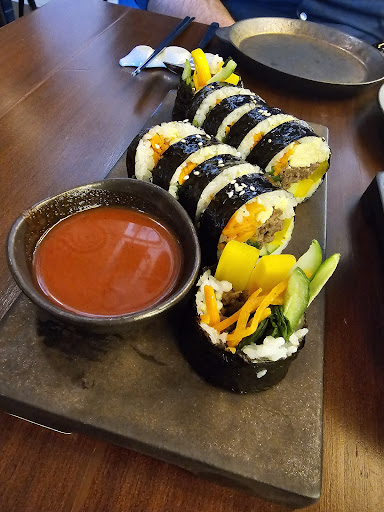 the location is somewhat hectic, and there is no sign to indicate the restaurant is here other than on the door. Once you enter, you are welcomed by the staff and asked about your reservation. The decoration is nice, with a focus on K-pop, a loud giant screen showing K-pop music videos, and a few K-pop memorabilia. the place is small, and the seating was kind of awkward(we were touching backs with the guy in the table behind me)! the menu was decent but had several items unavailable, and it was the first Korean restaurant that didn't have free side dishes(Banchan), or for the matter, the not free assorted side dishes(un available unfortunately), we asked for kimchi, but didn't get it for some reason. we ordered the Sinjeon Bibimbap, Sinjeon curry with chicken, garlic honey fried chicken, and Bulgogi Kimbap. overall, the food was decent, not great, but not too bad. the staff are still learning, we asked for Kimchi but didn't know if it was available or not, and we got sweet chilli Korean fried chicken instead of the garlic honey fried chicken, but it was replaced rather quickly, our waiter was overwelmed when mixing the Bibimbap and the spicy sauce was a mess. there were too many people watching, but I guess it's because the restaurant is relatively new.
