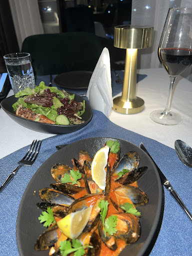 Когда я зашла в ресторан, сразу обратила внимание, что внутри никого нет кроме персонала. Заказала себе салат с угрем и мидии. Почему-то захотелось красного вина.