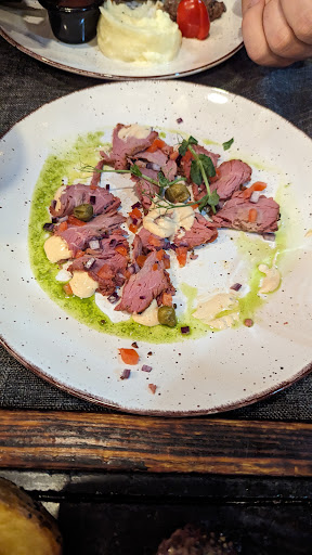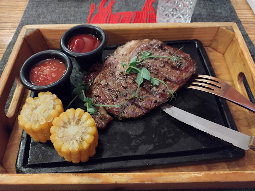 The ryb-eye premium steak was delicious and perfectly cooked as requested (medium). And this is the most important thing. Then, since they target an upscale customer, a perfect service is expected, starting with preparing properly the table, and possibly speaking a good English, but that was not the case. The ugly wodden box where they put the "dish" should be avoided, it remembers a cheap Chinese restaurant. Sofa is uncomfortable and not suitable for eating, maybe just for relax and drinking... Considering the premium price for Bishkek (over 40€), just for the meat (without side dish), a small dish of vegetables and water, without bread, the full experience is merely average. Next time I would try the normal steaks, probably their price is more suitable for this type of restaurant.