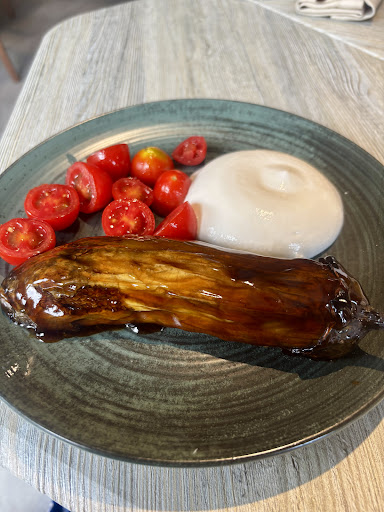 My second night I had a lovely whole roasted aubergine 🍆 (with miso?), with juicy cherry tomatoes and a goat cheese foam.