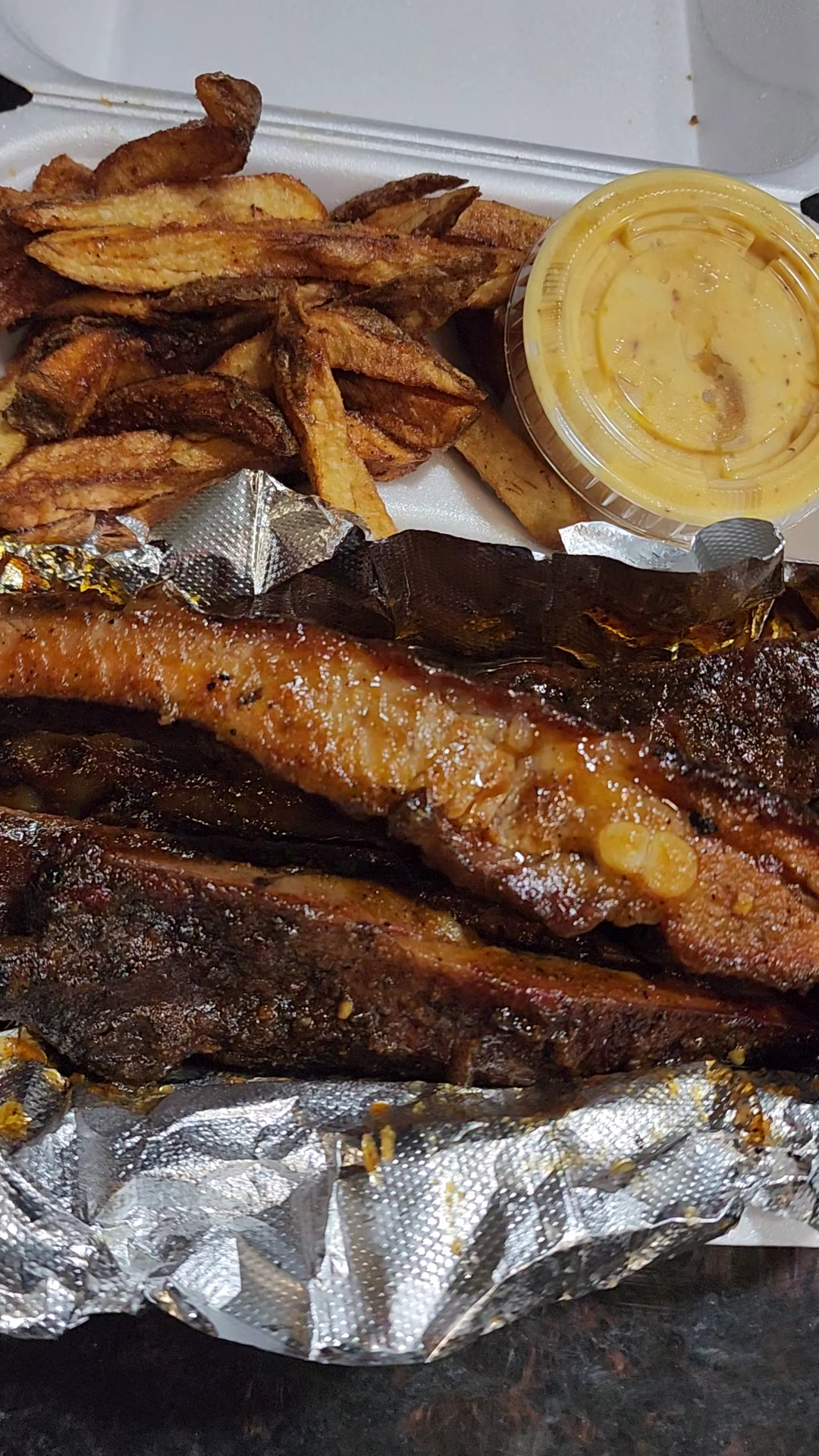 The food was a flavor explosion! That's the only way I can describe it. Literally EVERYTHING was well seasoned, even the fries which I believe are fresh cut. I loved that. The ribs were very tender, the sauce balanced with the seasoning of the meat perfectly. The wings were also very tasty as was the Mac and cheese. The Mac and cheese is different from any Mac and cheese that I have ever had, the flavor is distinct, almost a tiny bit sweet or maybe a little nutmeg, in not sure but we loved it. Whomever is cooking at this restaurant definitely knows what they are doing, they also have a great Instagram page. They beat part is that the food you get actually looks like what is on the page unlike some other places. Long story short, try this place, you won't be...
