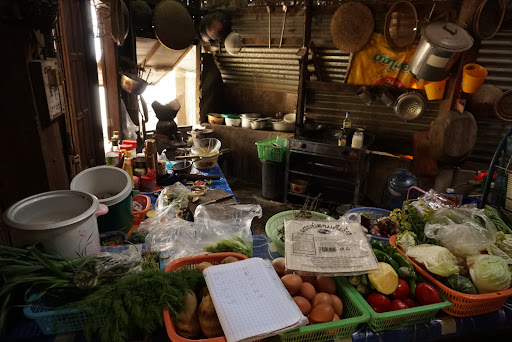 There's a lot of options- many vegetarian ones as well. While you wait, as every meal is prepared after another, you can learn some Lao (first side of menue), grab a book from the bookshelf, read through the extensively filled guestbook or check out the inside - with loads of photos from her throughout her life in the kitchen.