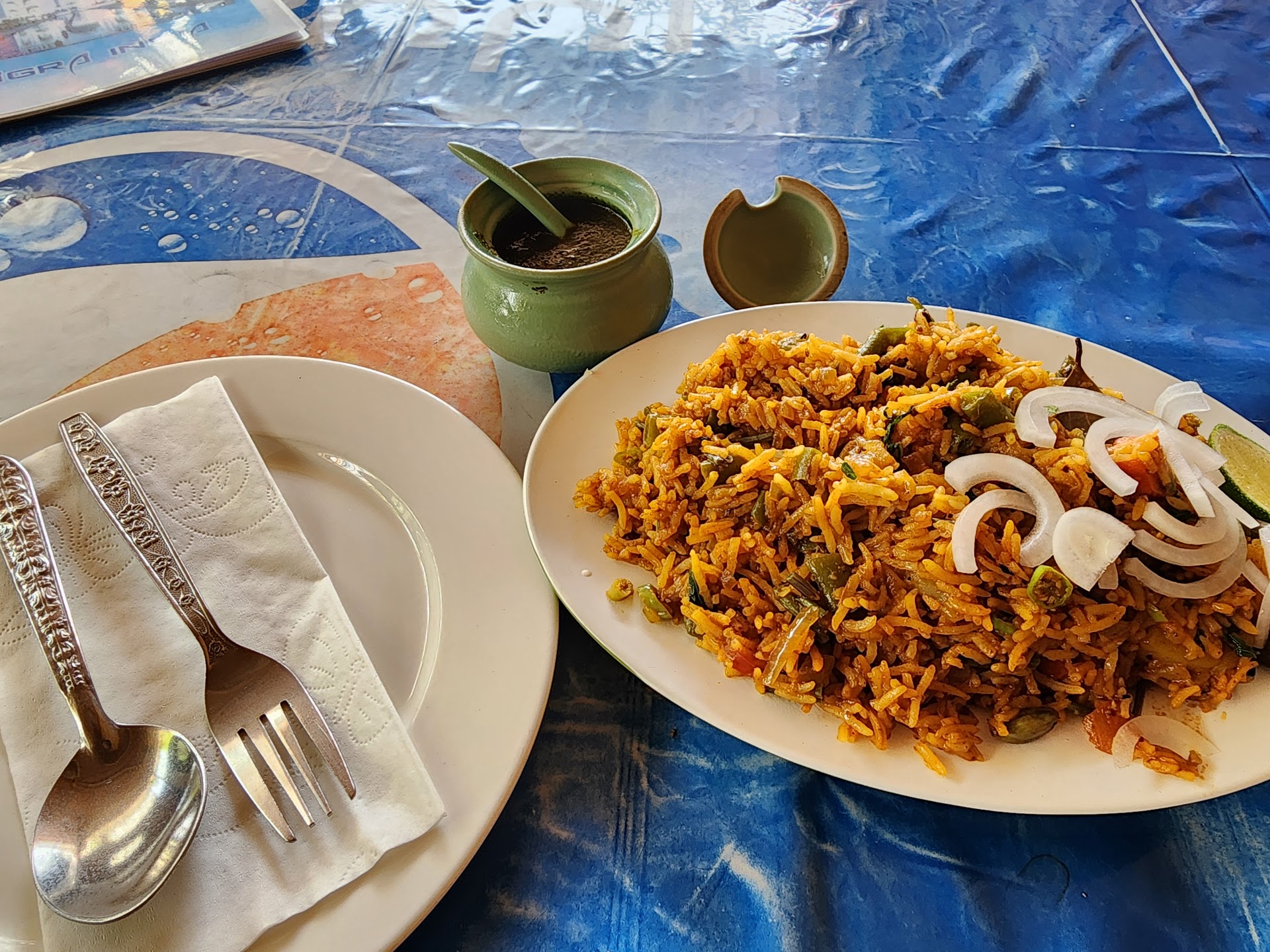 Really tasty curries - most delicious we've had in Vientiane. We had Aloo Tikki (10,000 kip) to start - came with a mint sauce - very nice, and not too greasy. Then we had Chicken Kolhapuri (25,000 kip) which was spicy enough for the both of us and the chicken was cooked beautifully and moist. Veg Jalfrezi (20,000 kip) which wasn't as spicy, but was really tasty and had a lovely kick. Daal Tarka (20,000 kip) which was really the bargain of the table - delicious and it was a very big serving. Garlic Naan (8,000 kip) looks like it was a bit dry, but it was fluffy inside and very tasty! 2 big Beerlao bottles (12,000 kip each) to wash it all down with. A very good experience and very tasty curries. Better than what we expected to be honest, looking from outside....