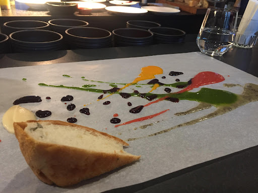 Whilst sipping on our cocktails we were served with some warm freshly baked bread. The chef suddenly became an artist on the baking paper in front of us drizzling different dressings to dip our bread in. We had apple puree, basil pesto, hempseed, berry and strawberry, so a real mix of sweet and savoury. We loved the pesto and hempseed which was so moreish!
